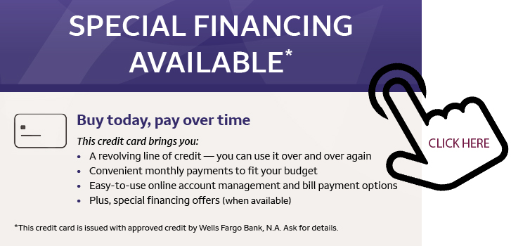 Depending on your purchase amount and current promotion, we regularly offer 6 month, 12 month, or 24 months special financing plans. With one of these plans and timely monthly payments, you can buy today and pay over time. Click the image below to apply online!